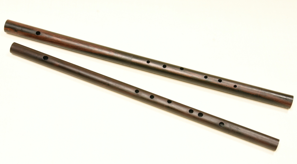 A partir da réplica da frauta que aparece na iluminación da Cantiga 240 do Códice dos Músicos das Cantigas de Santa María escalamos o seu tamaño ata conseguir unha frauta traveseira coa tónica inferior en Re. O seu interior é cilíndrico e non admite dixitacións cruzadas para emitir graos rebaixados. Amosámola en madeira de pau santo e na fotografía podedes ver tamén o seu tamaño comparado coa réplica da frauta das Cantigas de Santa María. Podedes escoitala aquí.